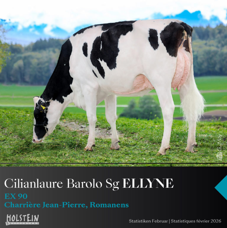 Cilianlaure Barolo Sg ELLYNE und ihre Halbschwester Cilianlaure Showking ESTHER von Charrière Jean-Pierre, in Romanens wurden beide im Monat Februar mit der Gesamtnote EX 90 eingestuft. Beide Kühe sind Töchter von Cilianlaure Adagio OLYMPIA und stellen jeweils die siebte Generation an EX eingestufter Kühe in einer Reihenfolge dar.