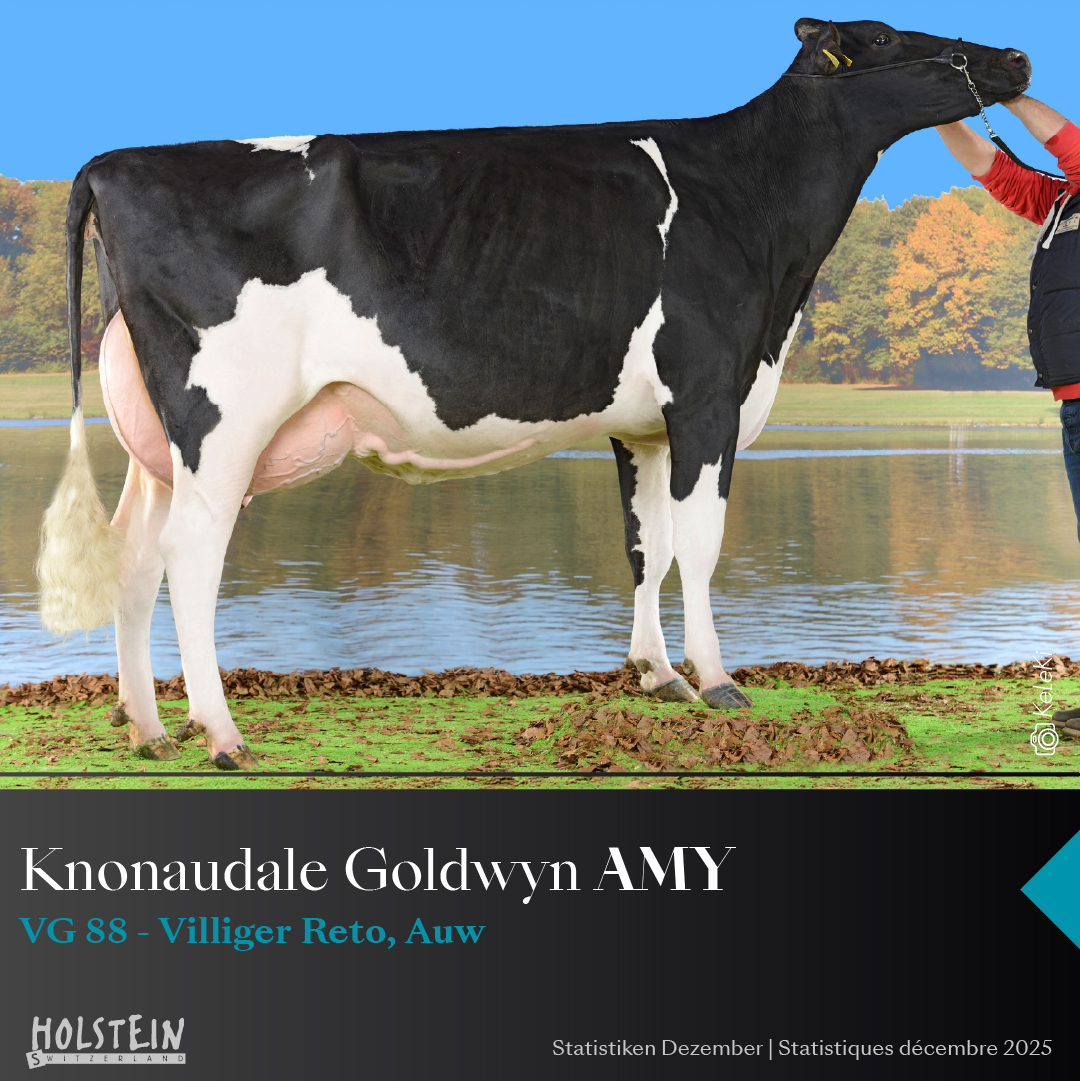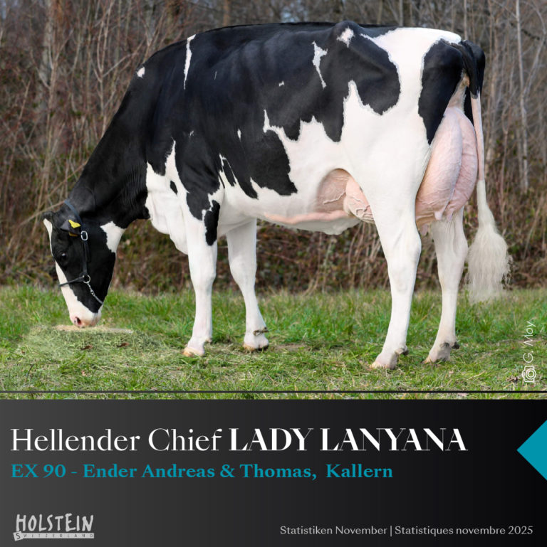 LADY LANYANA weist eine Einstufung von EX 90 vor, bei einer Lebensleistung von 80’897 kg mit Inhaltsstoffen von 4.03% Fett und 3.39% Eiweiss. LADY LAYLA ist EX 91 2E eingestuft, bei einer aktuellen Lebensleistung von 79’851 kg mit Inhaltsstoffen von 3.87% Fett und 3.31% Eiweiss.