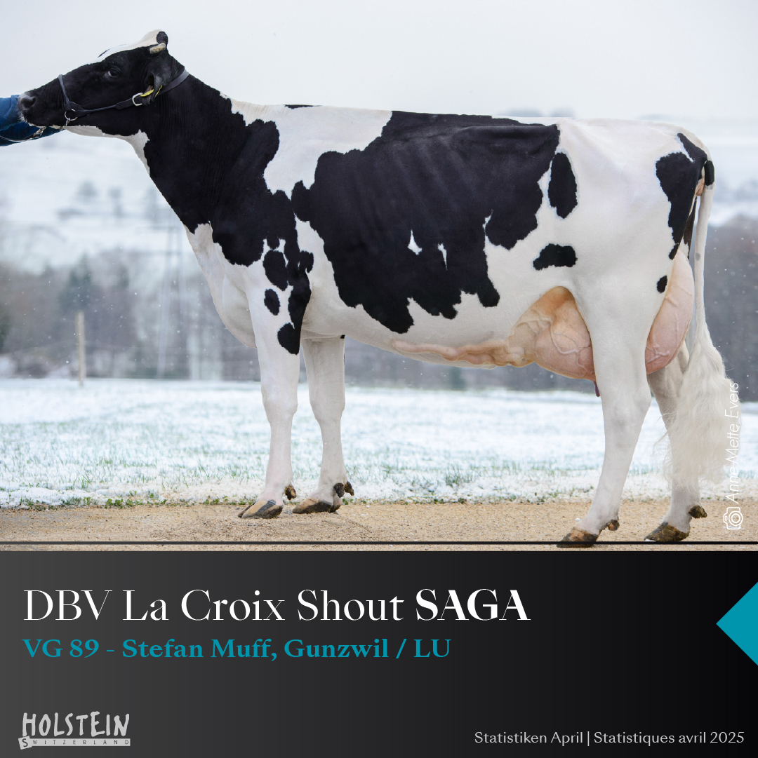 Dans sa sixième lactation, DBV La Croix Shout SAGA de Stefan Muff, à Gunzwil/LU, affiche une performance de vie actuelle de 170’220 kg. SAGA est classifiée avec une note globale de VG 89 et une note de système mammaire de EX 90. Grâce à ses propres performances, elle a déjà été récompensée par la Goldmedal. Toutes nos félicitations pour ce succès d’élevage !