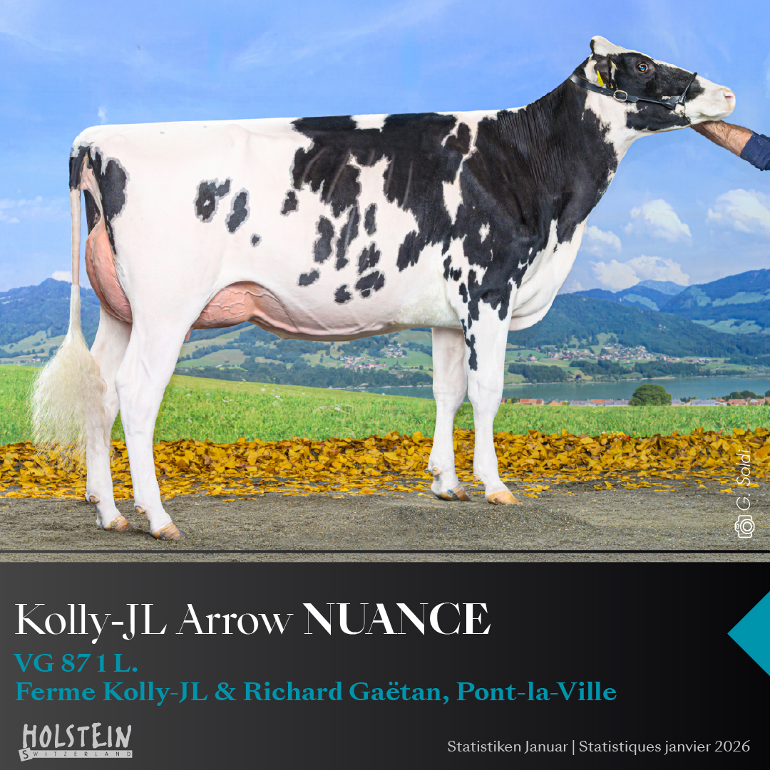 Après avoir remporté le titre de Championne Junior lors de la dernière Junior Bulle Expo, Kolly-JL Arrow NUANCE de la “Ferme Kolly-JL & Richard Gaëtan” à Pont-la-Ville, a obtenu en janvier la note globale de VG 87 durant sa première lactation.